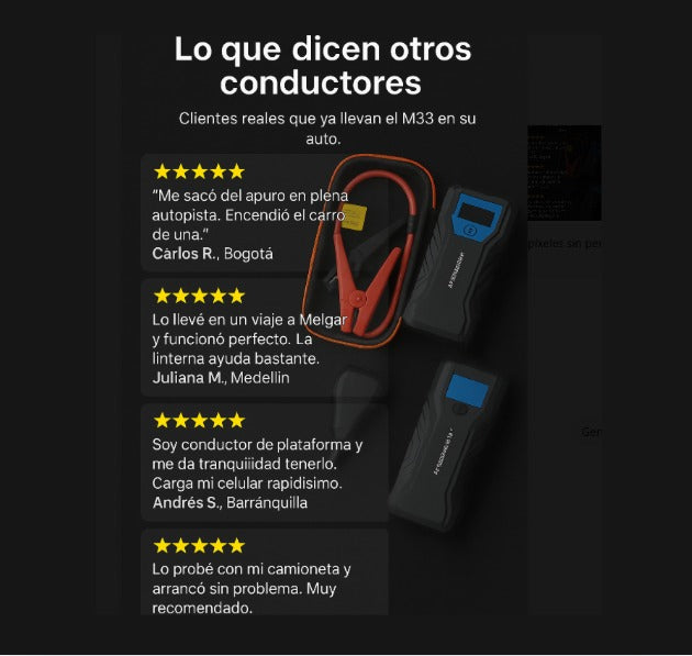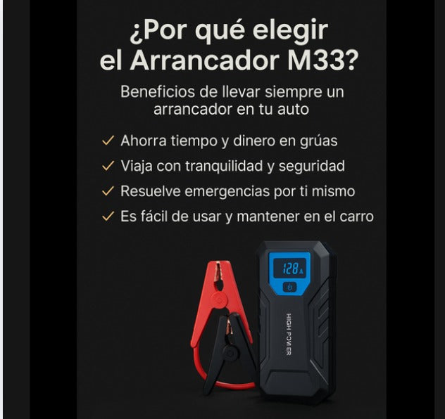 Sí, el M33 es un dispositivo 3 en 1: arrancador de batería, power bank para cargar celulares o dispositivos y linterna LED.